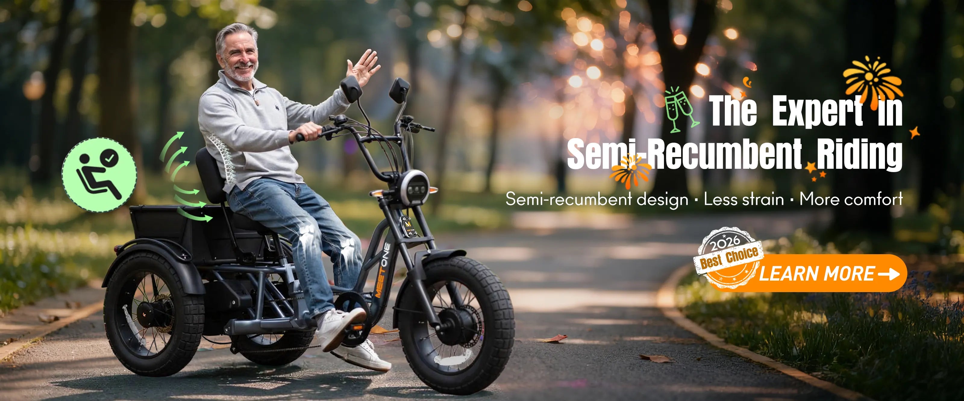 On the Meet One Tour, the relaxed, semi-recumbent posture keeps the rider’s shoulders and arms at ease, offering a significant benefit for those prone to neck or upper-body fatigue.